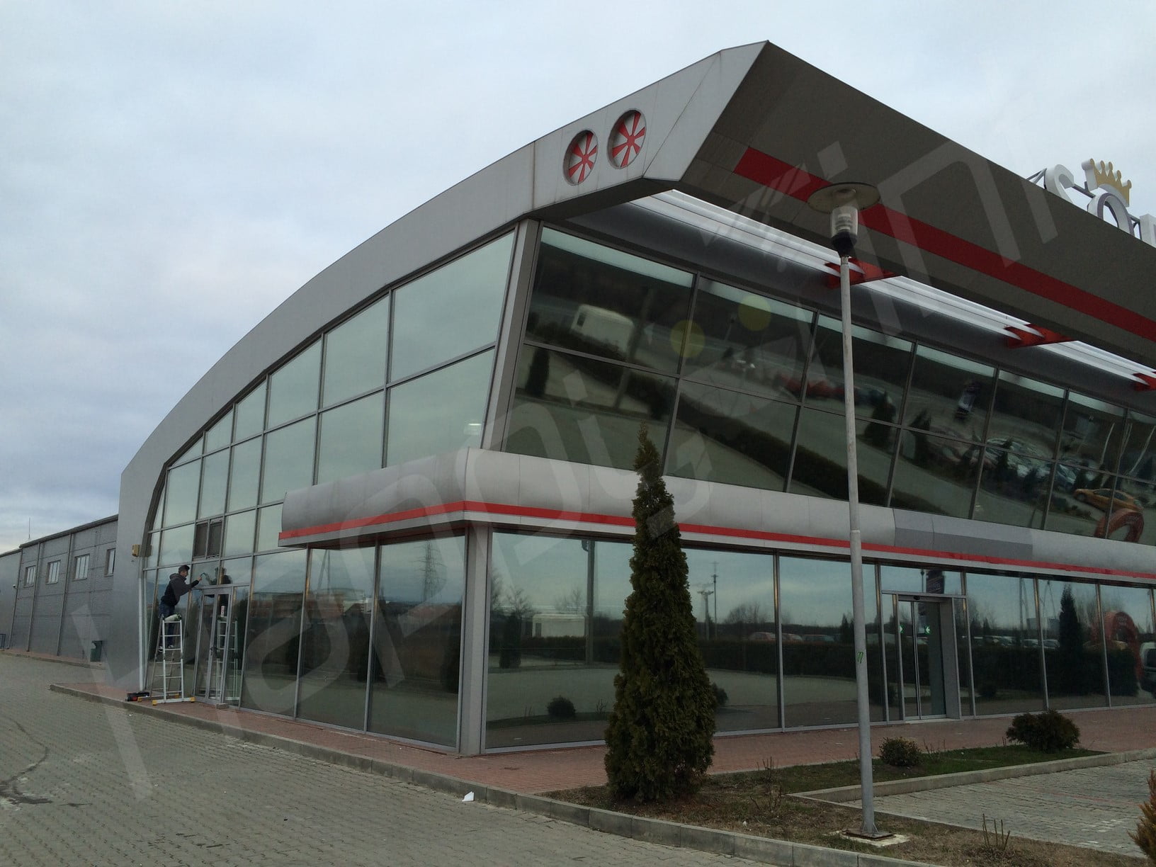 Clădirea fostului Showroom Auto în devenire fabrică de textile este localizată în Focșani, județul Vrancea, pe zona de sud, iar în cea mai mare parte a zilei, razele soarelui sunt proiectate asupra sa. Prin aplicarea foliei solare Silver 20% de interior, ne-am propus să eliminăm efectul de seră și radiația UV din încăpere. Fiind cel mai uzual produs de la Hanita Coatings, are dimensiuni standard diferite, de aceea pierderile în urma optimizării foliei pentru geamurile clădirii au fost minime. Folia aplicată pe interior este reflexiva, cu o capacitate mare de respingere a căldurii, de pana la 70%, iar a radiației UV, de pana la 99%. Totodată, reduce luminozitatea solara deranjantă, pana la 70%, iar garanția foliei aplicate este de 10 ani.